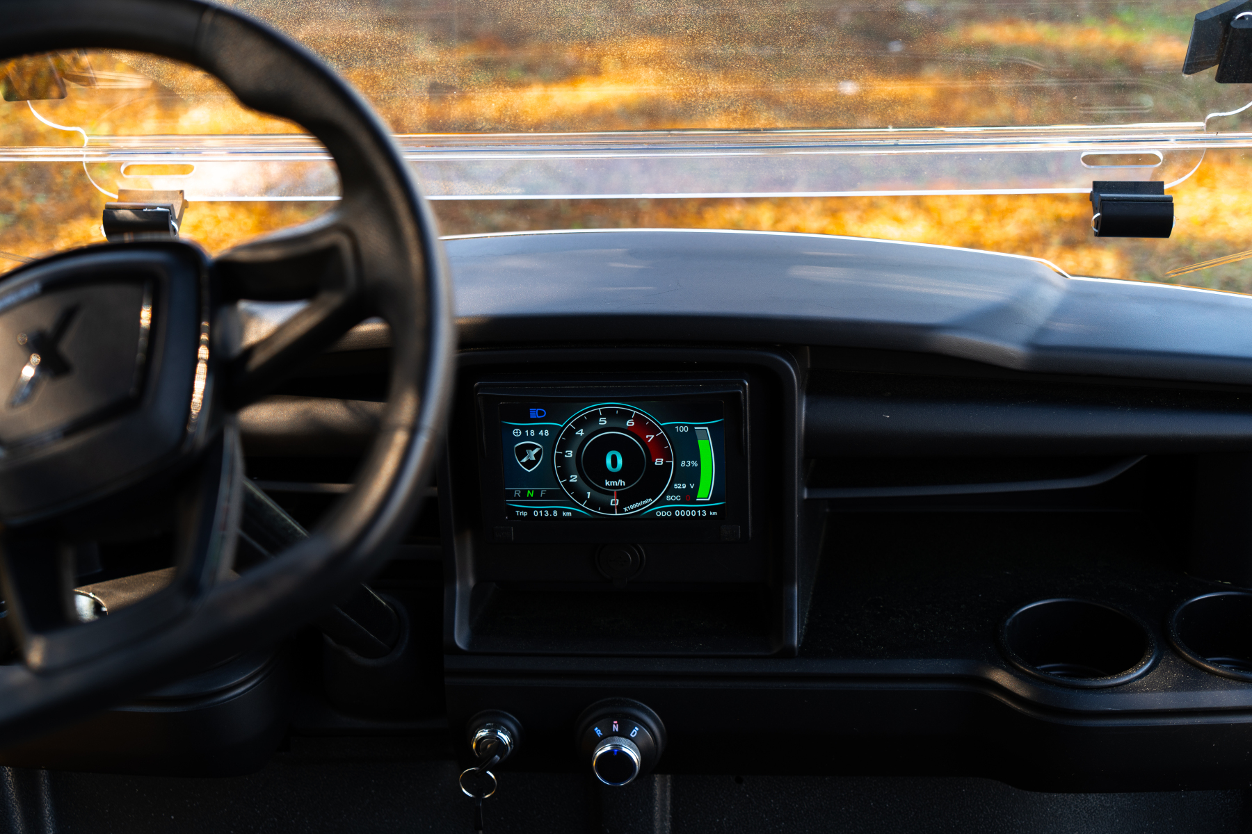 - Illuminated F N R gear selection switch in center of dashboard